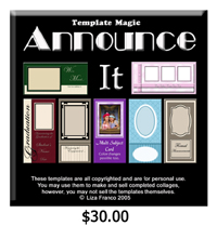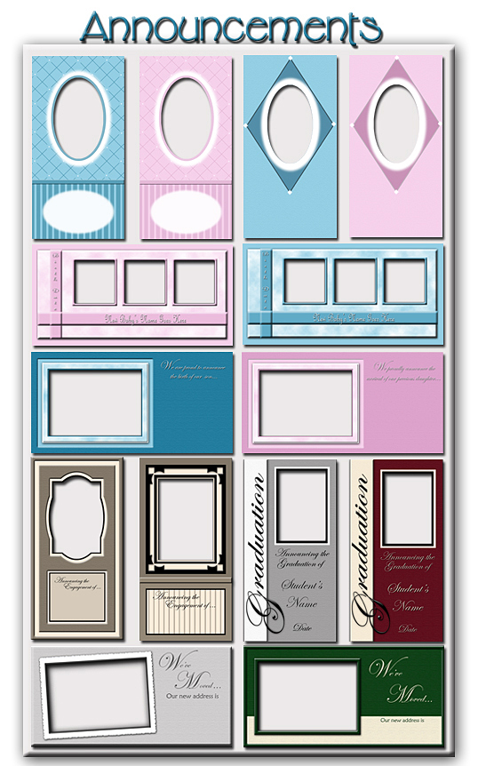 These templates are the perfect way to announce the arrival of a new baby, a graduation, engagement/wedding/formal event or that you have moved. There is also an all purpose card included. These print as 2-4”x8” cards on an 8”x10” sheet. The announcements will fit in a long letter envelope. Some have the possibility of Color/Hue change. You can offer your clients announcements that are fresh and new. Look for Announce It 2 which is set for release Summer 2006.