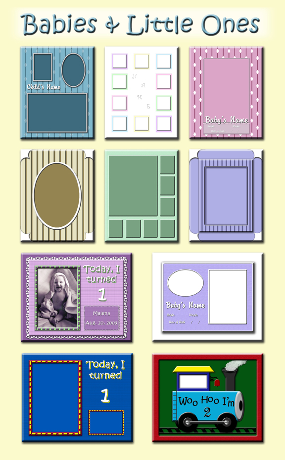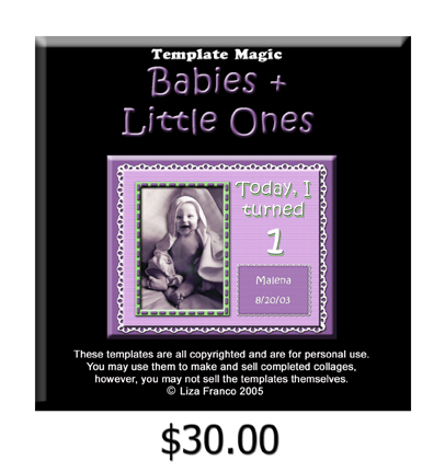 Enhance your photos with Digital Templates. These templates were designed to help fellow photographers give their clients unique keepsakes. Please note that these templates are only for sale to individual, privately owned studios. They are Photoshop compatible and speed up the work load. They print as an 8x10 and in some cases allow for color changes. Each cd contains at least 10 templates. Simply open a template in Photoshop, open your photo and drag it over to the template. The template and photo print all on one page for a clean, professional look. Offer your clients something really unique and stay a step ahead of your competition with customized templates.