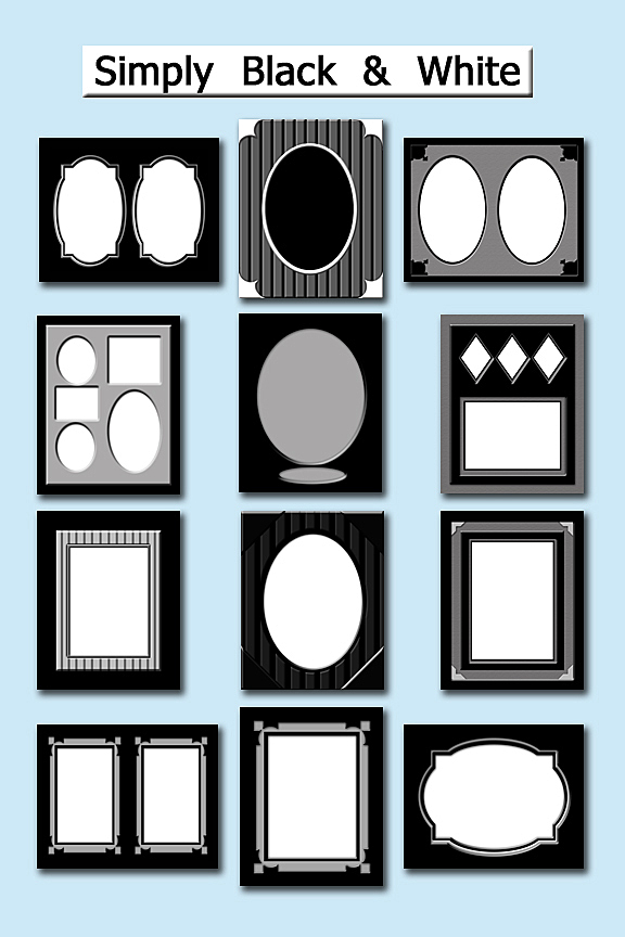 Black and White Portraits are often framed in a very simplistic fashion. However, for those who dare to be different, these templates can give your black and white portraiture a look that makes them stand out from your competition. Offer your clients something unique and watch your sales soar. The shades of the templates are variations of black, gray & white for a beautiful portrait enhancement.