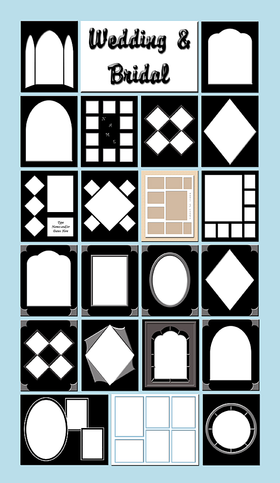 The majority of the templates on this cd are designed to look like black pages to fit in albums. These can then be place in the center of a larger print area to fit different sized albums. In some cases you may be able to change the color. These are really beautiful designs which enhance the portraits of someone's special day. They are also nice to present as a finished piece to a new bride and groom as your Thank You gift to them for selecting your studio.