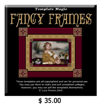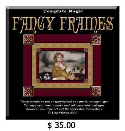 If you’re looking for something on the ornate side, Fancy Frames may be the template cd for you. These have special patterned mat effects and fabric effects. Some have ornamental elements added to give a Victorian or Medieval look. These frames work well with simple portraits that aren’t too busy, as the frames themselves usually have a lot of layers. Colors/Hues can be changed on many of the templates on this cd.
