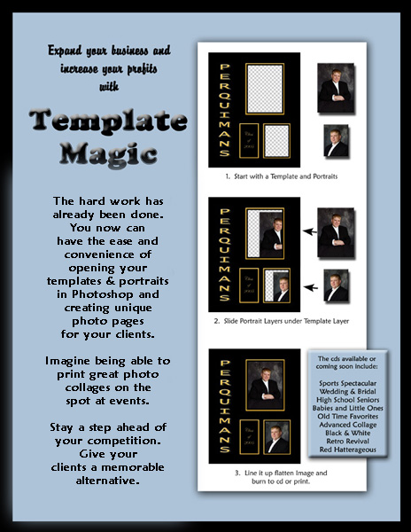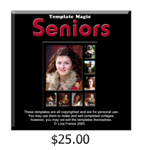 Enhance your photos with Digital Templates. These templates were designed to help fellow photographers give their clients unique keepsakes. Please note that these templates are only for sale to individual, privately owned studios. They are Photoshop compatible and speed up the work load. They print as an 8x10 and in some cases allow for color changes. Each cd contains at least 10 templates. Simply open a template in Photoshop, open your photo and drag it over to the template. The template and photo print all on one page for a clean, professional look. Offer your clients something really unique and stay a step ahead of your competition with customized templates.