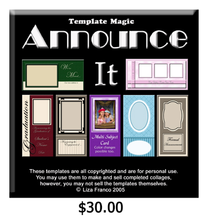 These templates are the perfect way to announce the arrival of a new baby, a graduation, engagement/wedding/formal event or that you have moved. There is also an all purpose card included. These print as 2-4”x8” cards on an 8”x10” sheet. The announcements will fit in a long letter envelope. Some have the possibility of Color/Hue change. You can offer your clients announcements that are fresh and new. Look for Announce It 2 which is set for release Summer 2006.