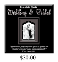 The majority of the templates on this cd are designed to look like black pages to fit in albums. These can then be place in the center of a larger print area to fit different sized albums. In some cases you may be able to change the color. These are really beautiful designs which enhance the portraits of someone's special day. They are also nice to present as a finished piece to a new bride and groom as your Thank You gift to them for selecting your studio.